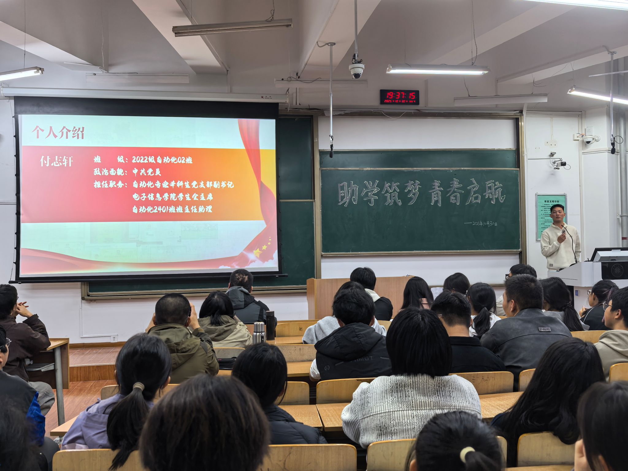 10月30日,在教学楼B-233,电子信息学院举办了2025年“一站式”学生社区“助学筑梦 青春启航”第三场榜样巡讲活动。本次活动邀请了2024-2025学年国家奖学金获得同学用身边故事讲身边理,为2025级479名同学带来了一堂又生动又有活力的新生入学教育思政课。