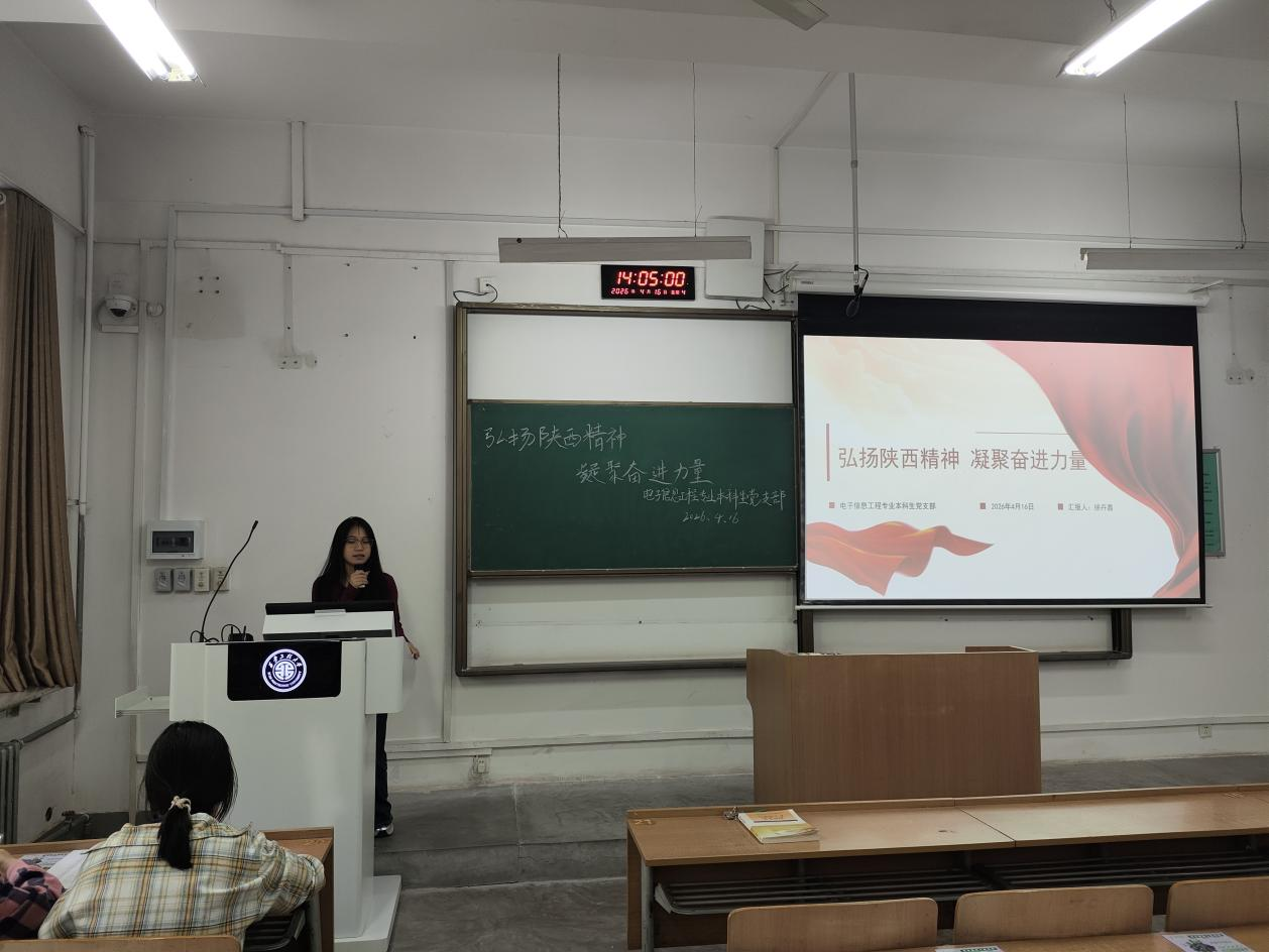 2026年4月16日,电子信息工程专业本科生党支部在教学楼A-130开展“弘扬陕西精神 凝聚奋进力量”主题党日活动。本次活动由张腾玥主讲,支部党员及部分入党积极分子共同参与。