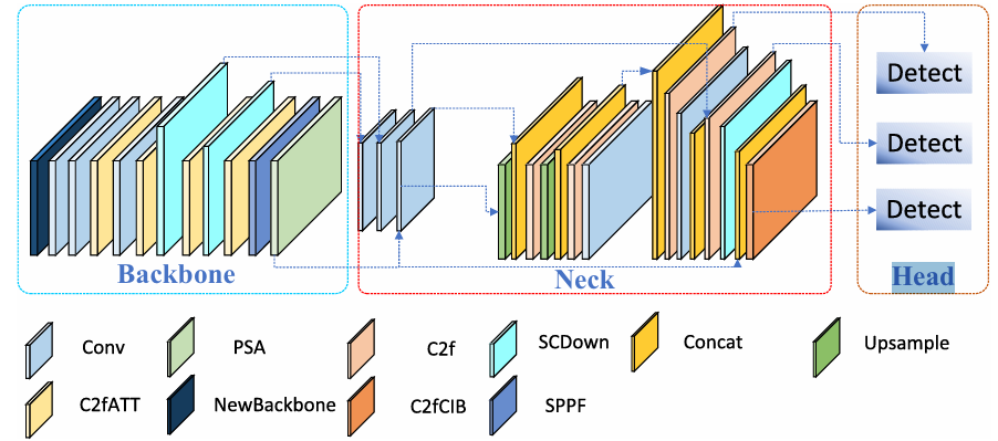 论文2 “Enhanced YOLOv10 with Bidirectional Feature Fusion and Dual Attention for Precise Surgical Instrument Detection.” 聚焦器械检测与位姿信息获取:论文聚焦机器人辅助手术中腹腔镜器械的实时检测与位姿信息获取场景,提出改进框架 YOLOv10-BFDA:通过双向特征融合促进多尺度特征交互,并在骨干网络中引入通道注意力与像素注意力以突出细粒度关键信息,同时结合自适应多尺度注意模块动态加权不同层级特征,增强多目标、多尺度条件下的检测稳定性与精度。实验在 M2CAI16-Tool-Locations 数据集上取得 96.5% mAP@0.5、62.9% mAP@0.5:0.95 的结果,体现了其面向低延迟临床应用的潜力。