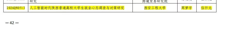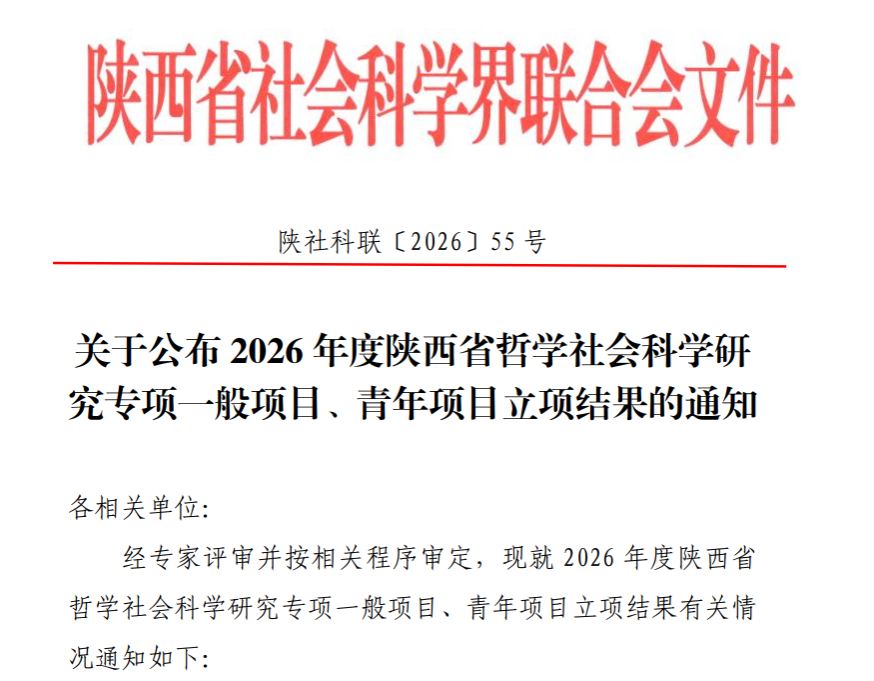 近日,陕西省社科联公布 2026 年度陕西省哲学社会科学研究专项一般项目、青年项目立项结果的通知,我院周梦宇青年教师所申报的青年项目获批,获批经费0.5万元。
